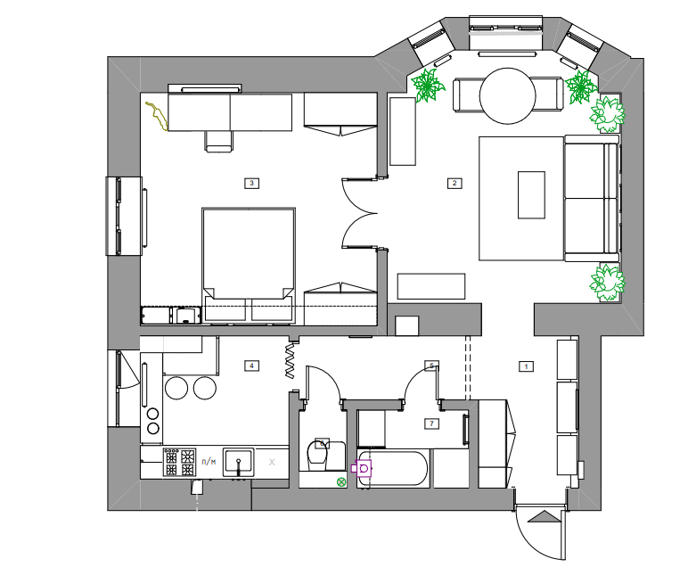 Важно было выделить зону для хобби — вышивания, организовать её у окна, чтобы было много естественного света. Также одним из пожеланий было сохранить оригинальный потолок со сводами, отказаться от телевизора в пользу проектора и предусмотреть минималистичную кухню с барной — заказчица почти не готовит дома.