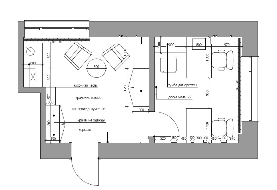 — второй превратили в многофункциональную комнату: здесь разместили мини-кухню, места хранения и зону для встреч.