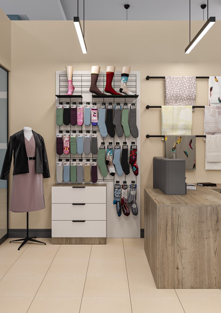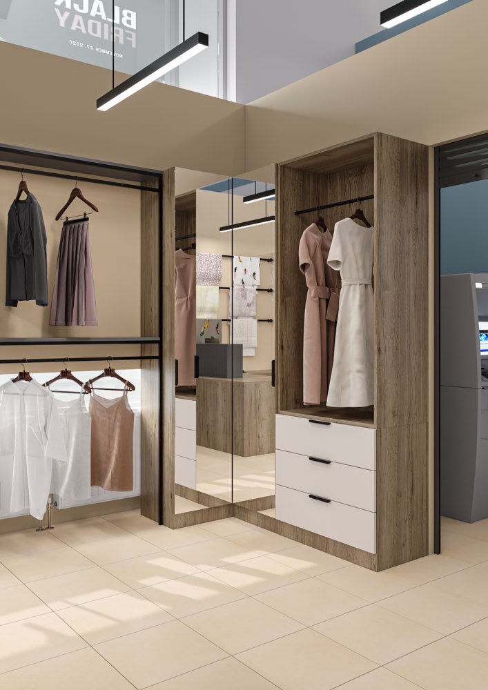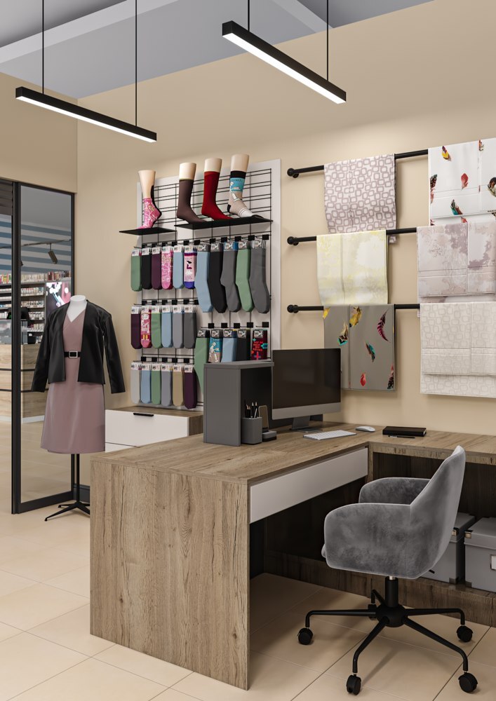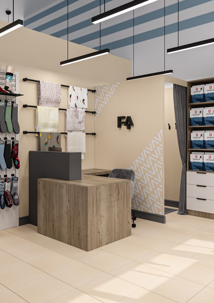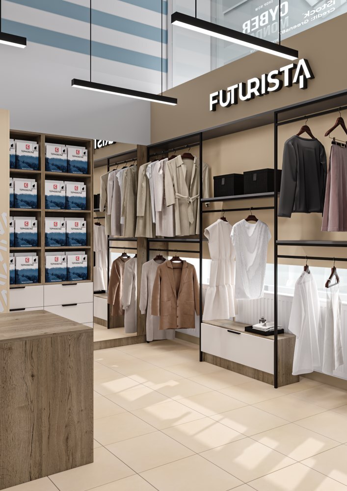 Оформить компактный отдел в торговом центре по продаже термобелья и одежды из льна. Нужно было максимальное количество вешал и мест хранения, сделать примерочную, витрины для аксессуаров и термобелья, поставить манекен, кассовый стол, брендированную стену и вывеску. Дизайн должен соответствовать брендбуку и философии марки заказчика.
