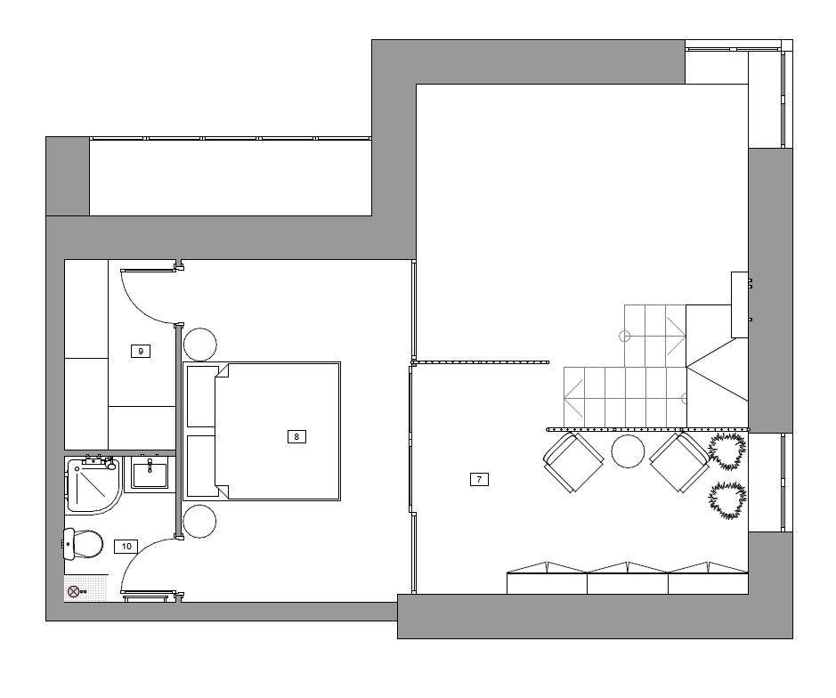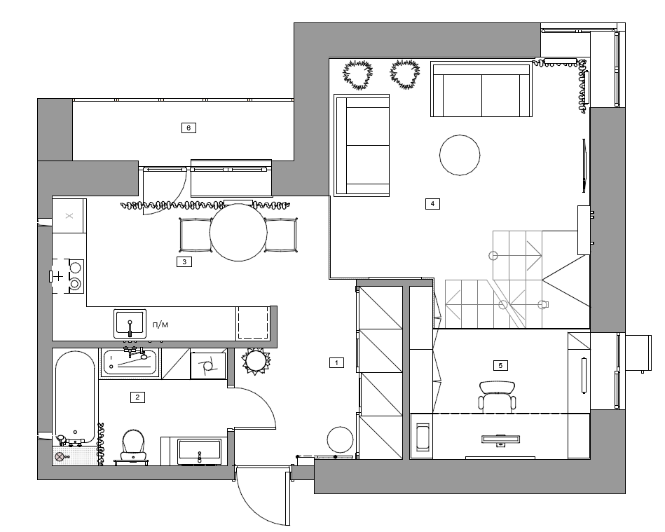 Высокие потолки дали нам фору — мы использовали пространство по максимуму и добавили антресоль, где разместились дополнительные функциональные зоны. Там получилось уютное местечко у перилл и окна для чтения, там же будет стеллаж для сувениров, у заказчиком их много.