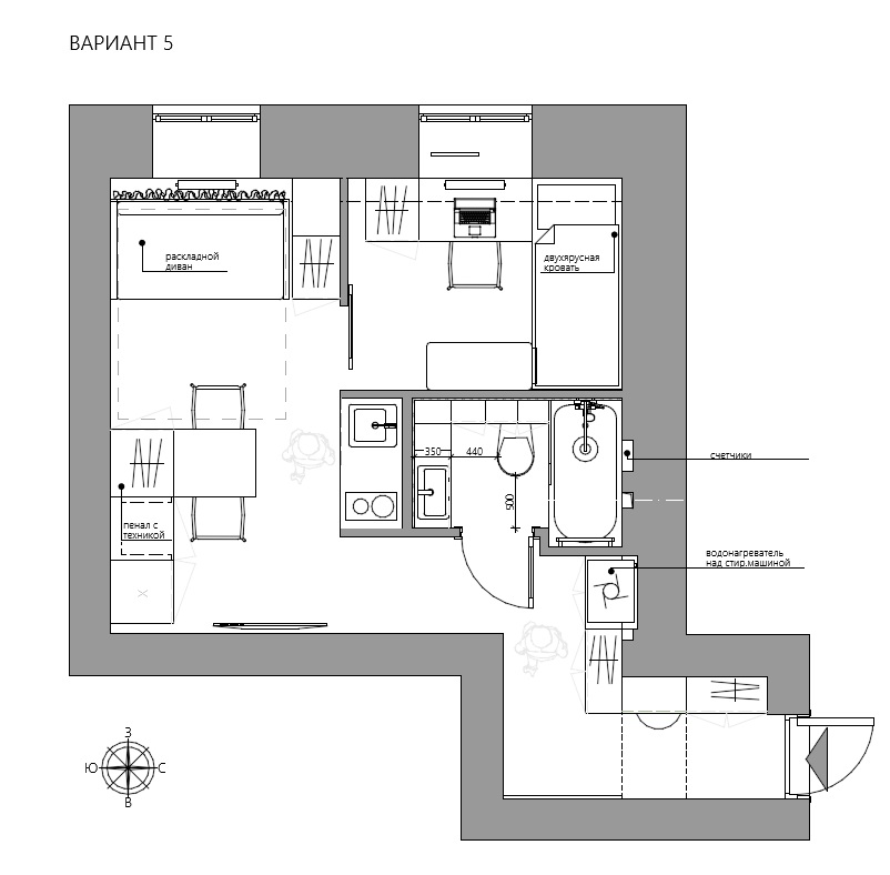 — разместить зону для проживания двух человек с дополнительным спальным местом, например, для ребенка;